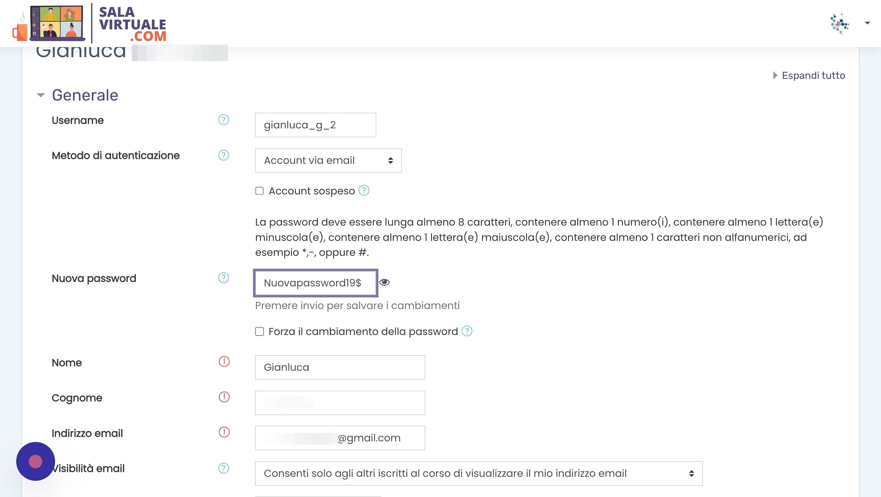 5. Scriviamo la nuova password, che deve contenere lettere maiuscole e minuscole, numeri e un carattere speciale.